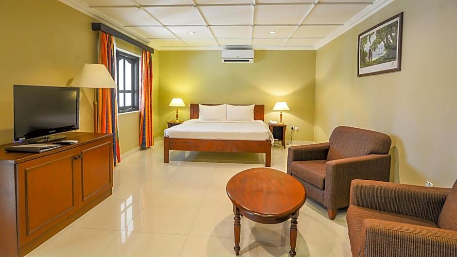 Deluxe Family Room is 646 square feet and includes a king-size bed 150-183 width plus living room and is Wheelchair-accessible.